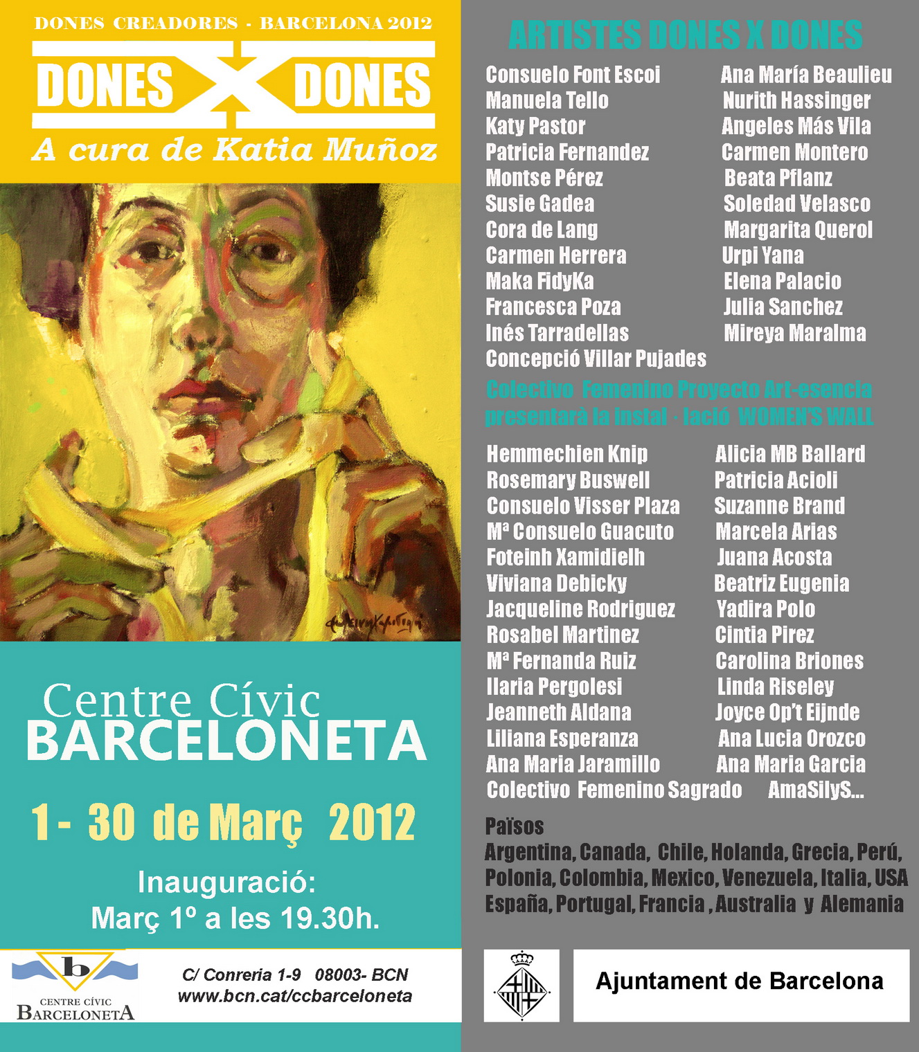 Ana María Beaulieu :: BCN – Manuela Tello :: BCNNurith Hassinger :: BCN – Katy Pastor :: BCNCarmen Montero :: BCN – Patricia Fernandez :: AlicanteAngeles Más Vila :: Valencia – Montse Pérez :: BCNBeata Pflanz :: Polonia – Ines tarradellas: BCNSoledad Velazco :: Madrid – Cora de Lang :: AlemaniaMargarita Querol :: BCN – Carmen Herrera :: FranciaConsuelo Font Escoi :: BCN – Urpi Yana :: ValenciaMaka FidyKa :: BCN – Elena Palacio :: BCNFrancesca Poza :: BCN – Julia Sanchez :: BCNMireya Maralma :: BCN – Susie Gadea :: MadridConcepció Villar Pujades :: BCNColectivo Femenino Proyecto Art-esencia :: BCN